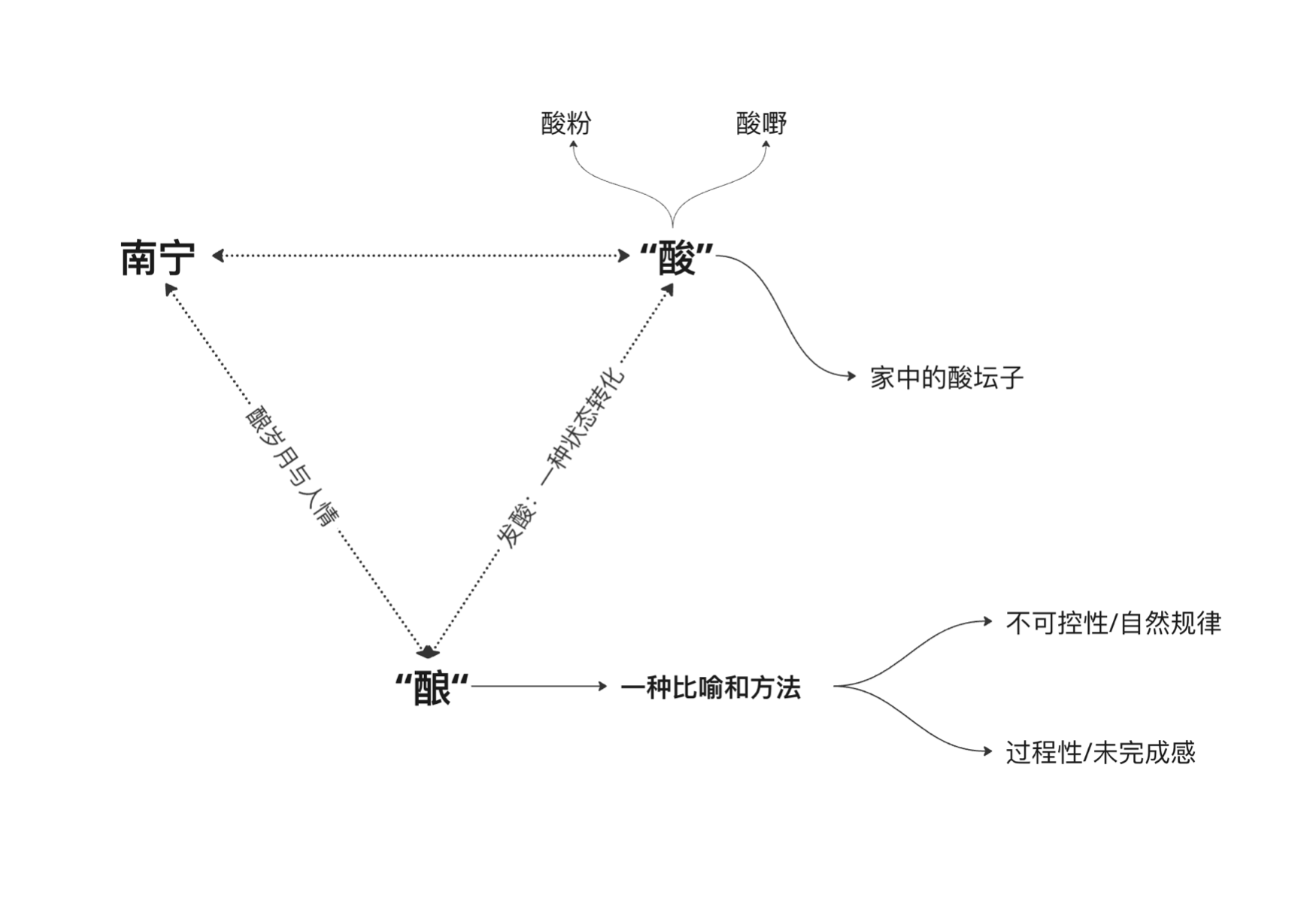 在广西家乡的味觉记忆里,“酸”是一种独特的味道和符号,随处可见的酸嘢酸粉摊,从小吃到大的酸笋味。 “酸”是酝酿出来的味道。家中的酸坛子——每家每户有属于自己的酸味,这是一种情绪化的酸,一种看不见的流动,一种关系的羁绊。