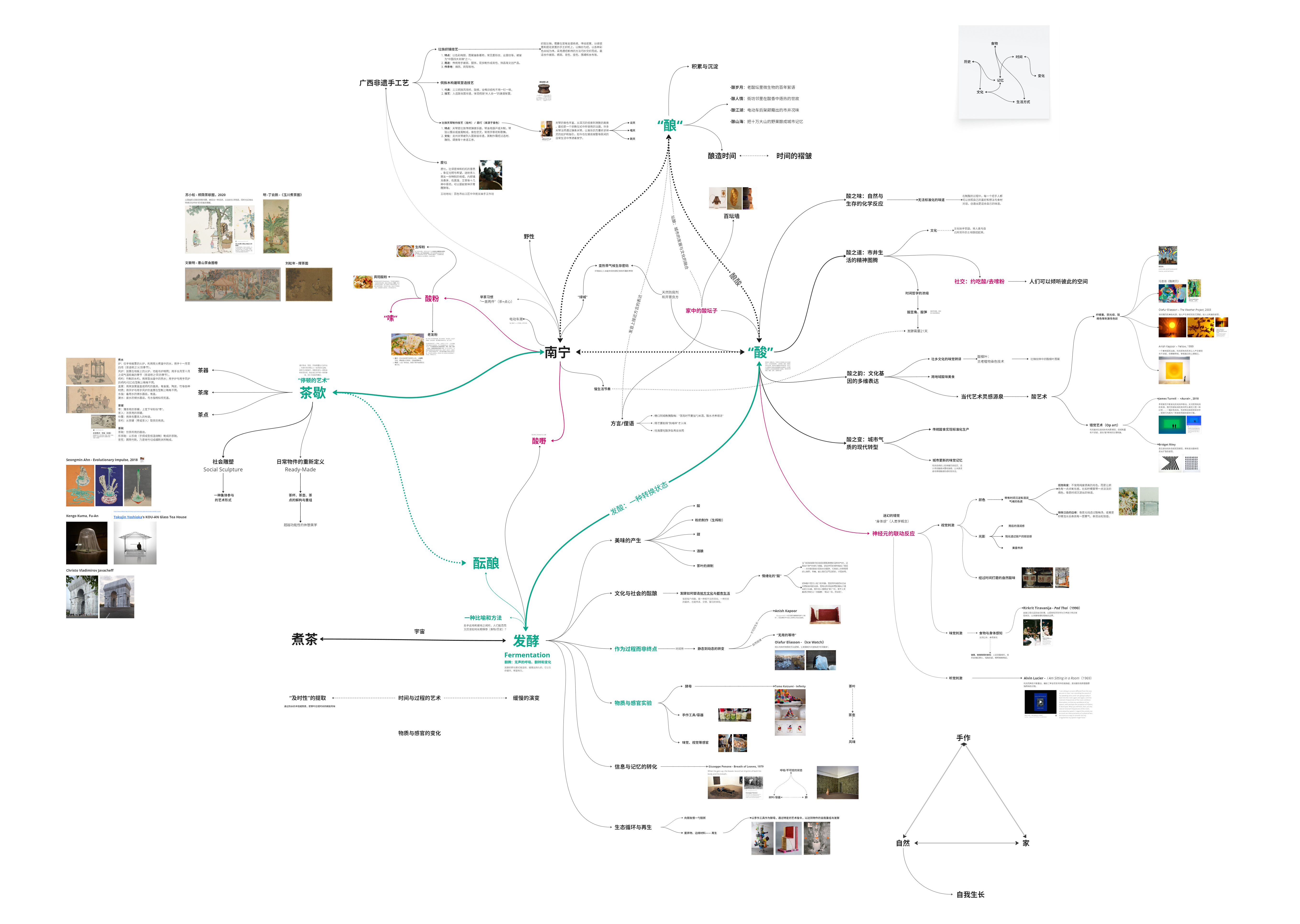 发酸本质上是一种状态的变化,生命在缓慢持久的温和变化不断循环。在此次装置设计中,我们将“发酸”视为一种比喻和方法,试图描绘物质从静态到动态的转变。我们选取了本地酸嘢铺中常用的酿酸玻璃罐和塑料沥水盆作为载体,原本玻璃罐中的酸嘢被替换成了六堡茶叶,其作为后发酵茶,与酿酸一样在随着时间不断陈化风味。