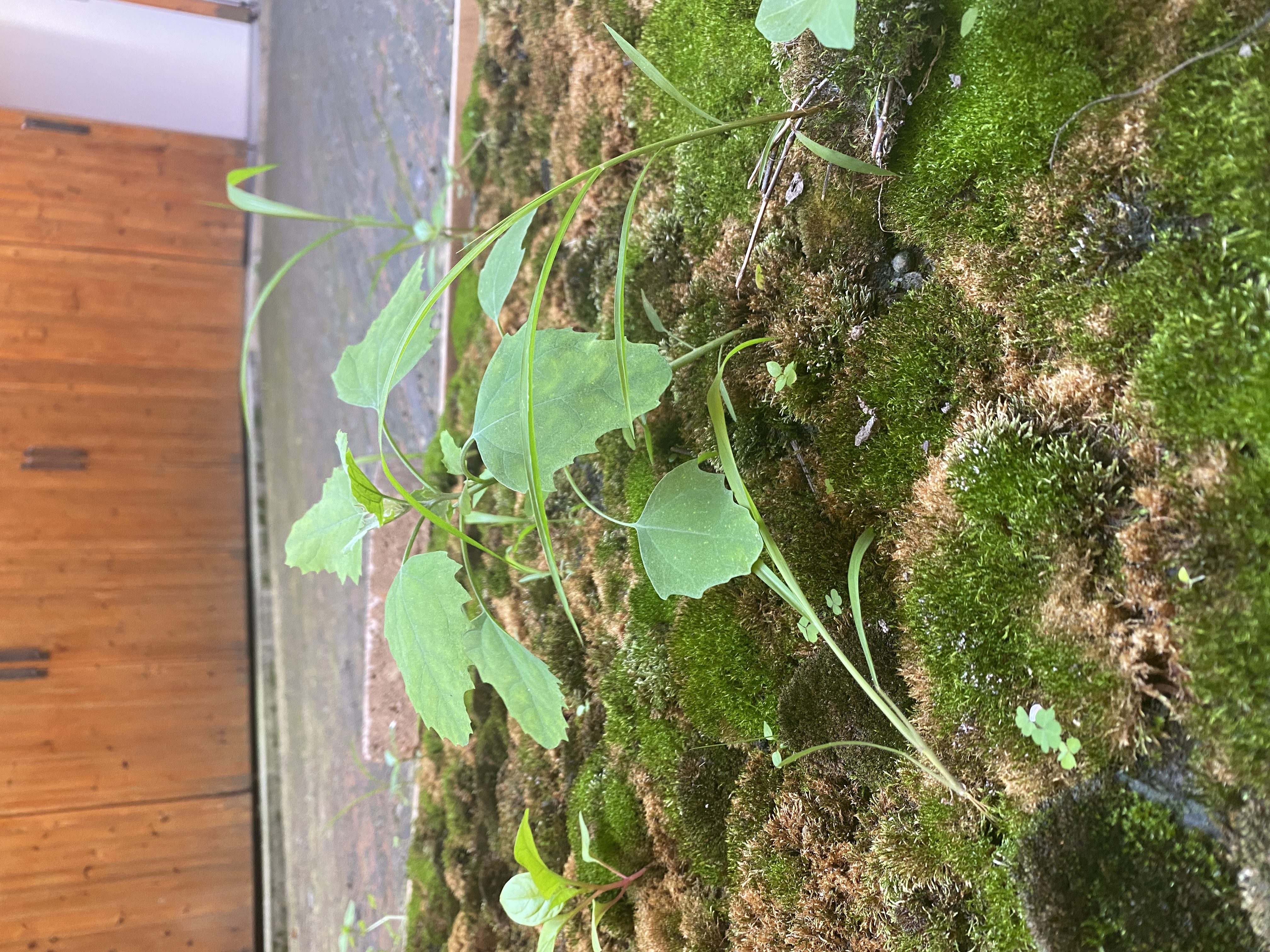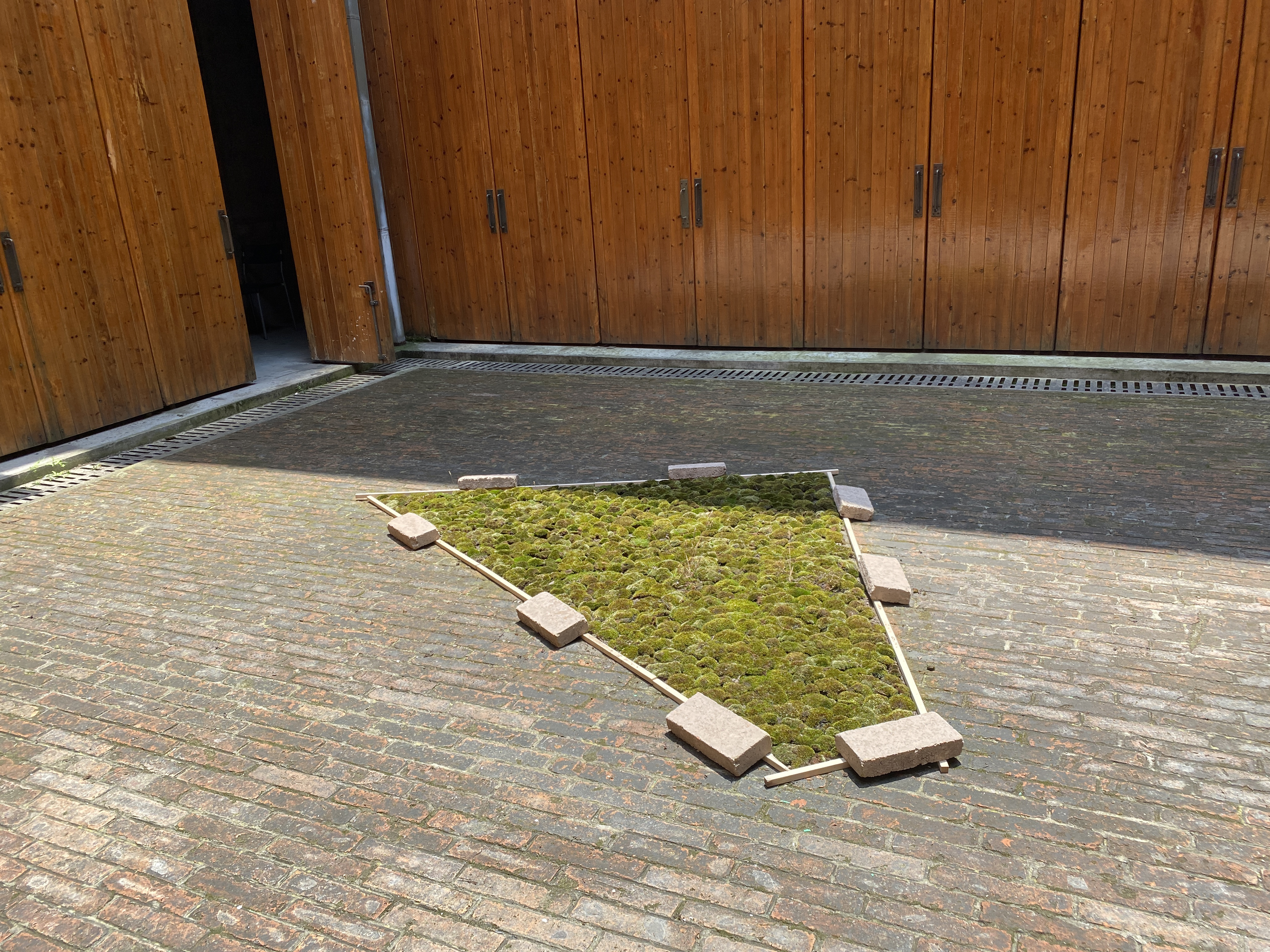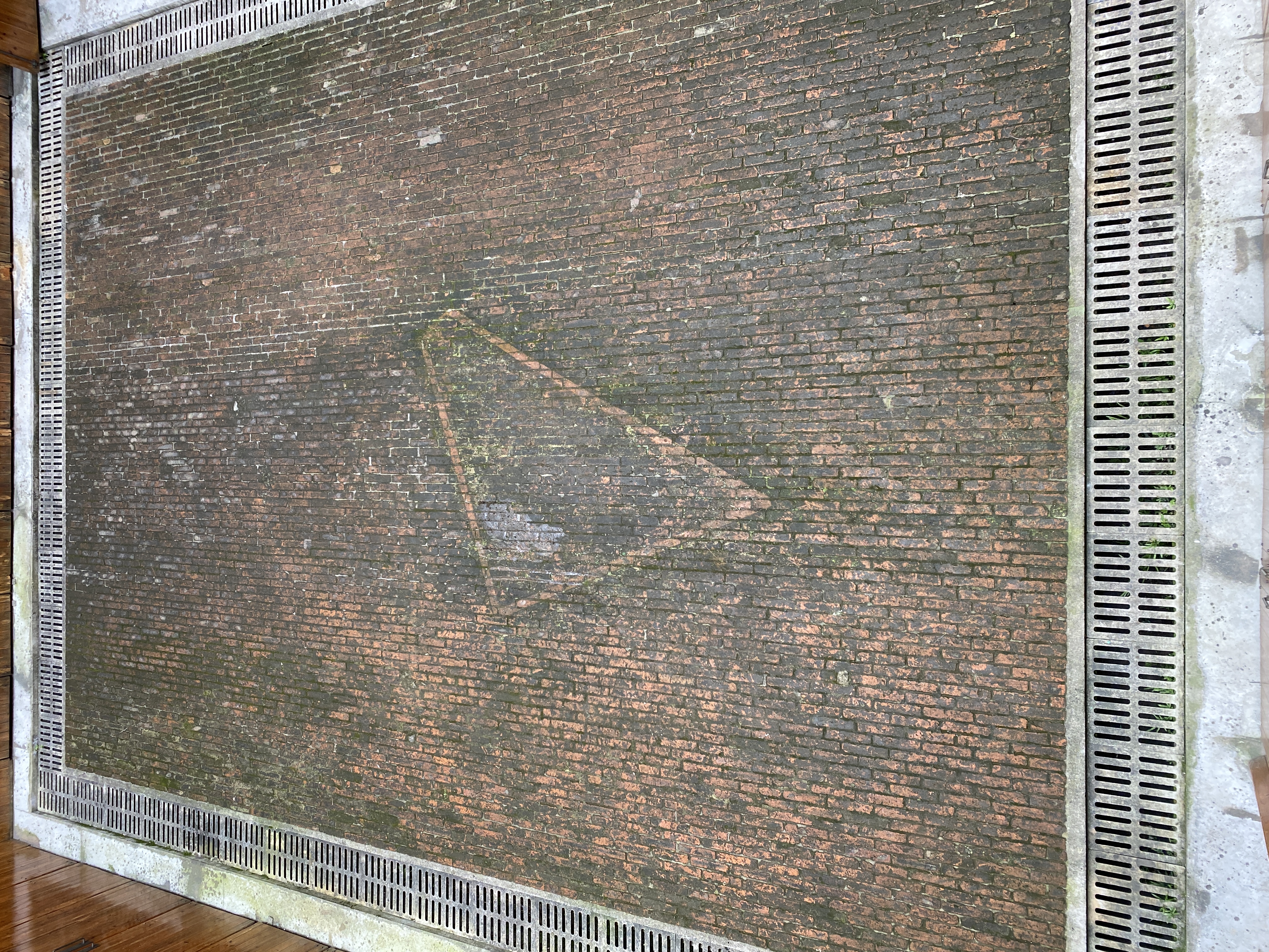 Up on the roof to photograph the courtyard green moss was found. How nice it would be if moss grew on the bricks in the green triangle.