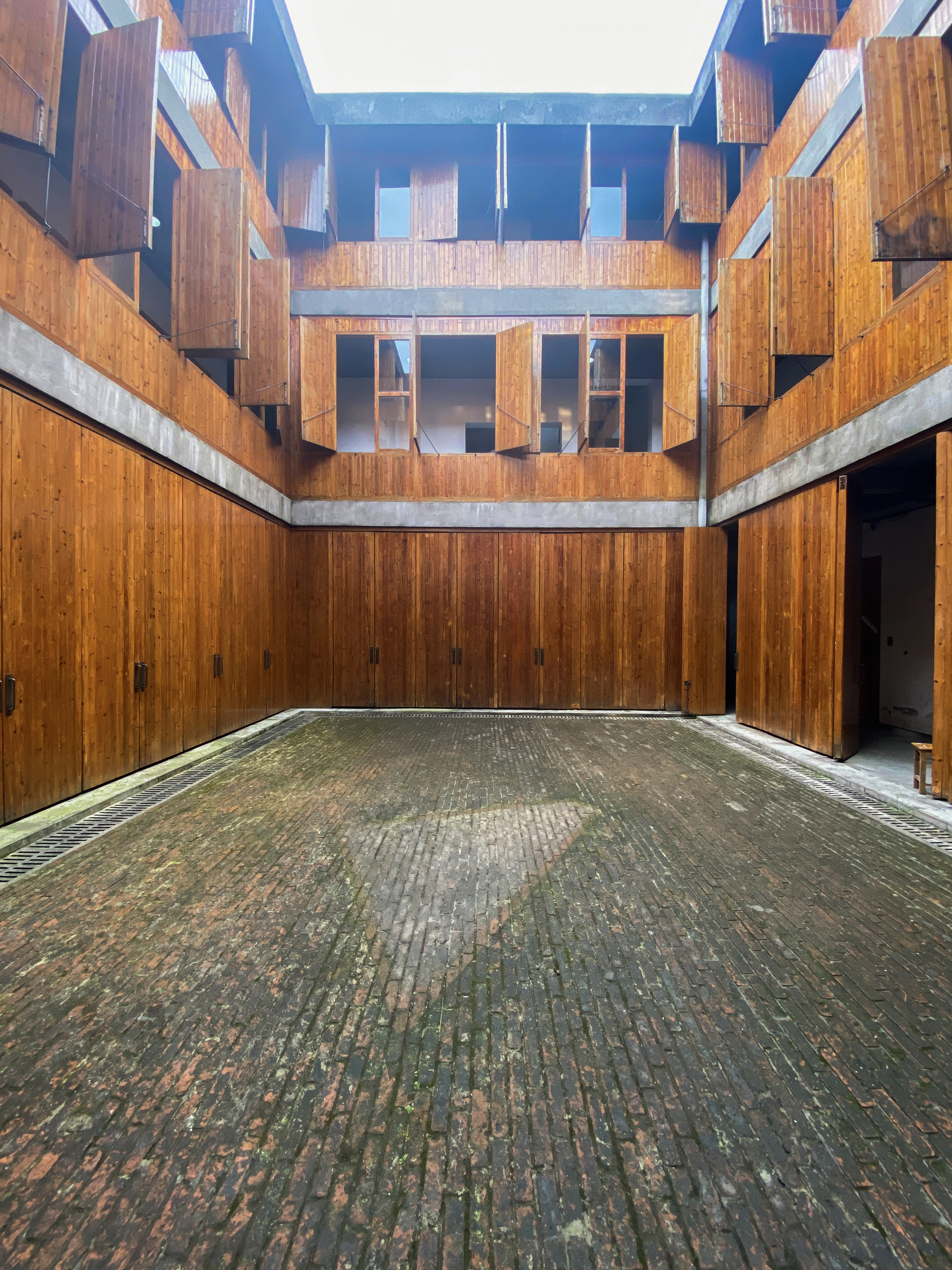 The architects look out into the courtyard from time to time thinking it’s a tropical forest, keen to go and water it as soon as possible. Water, water, water, but large clumps of moss couldn't survive on the brick walls. The architect dug up more moss and placed it beneath, creating a framework for them.